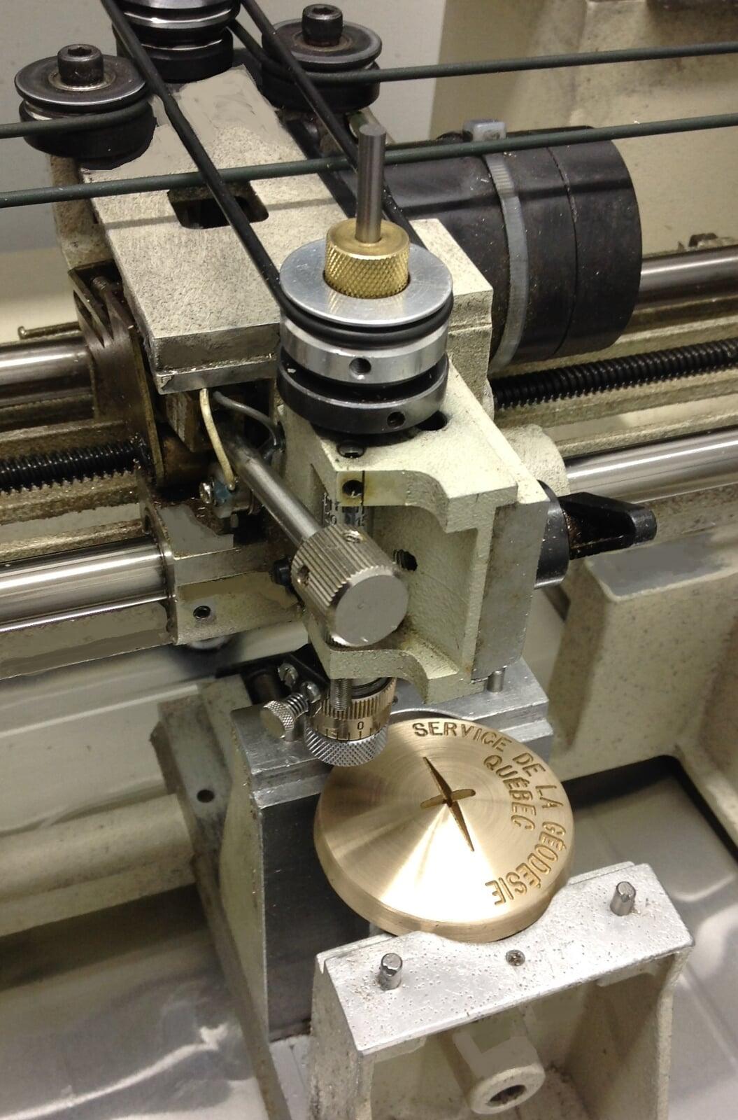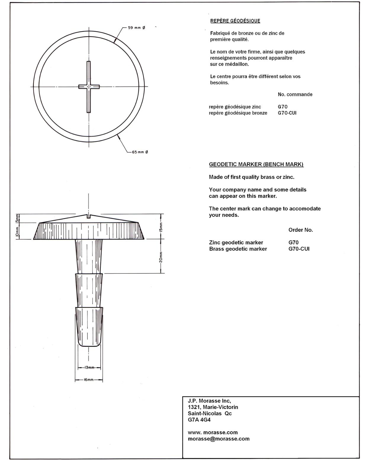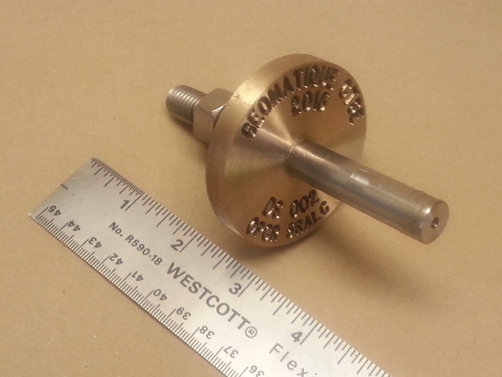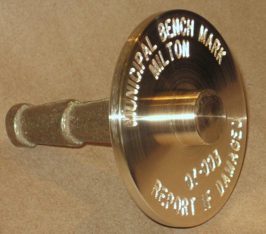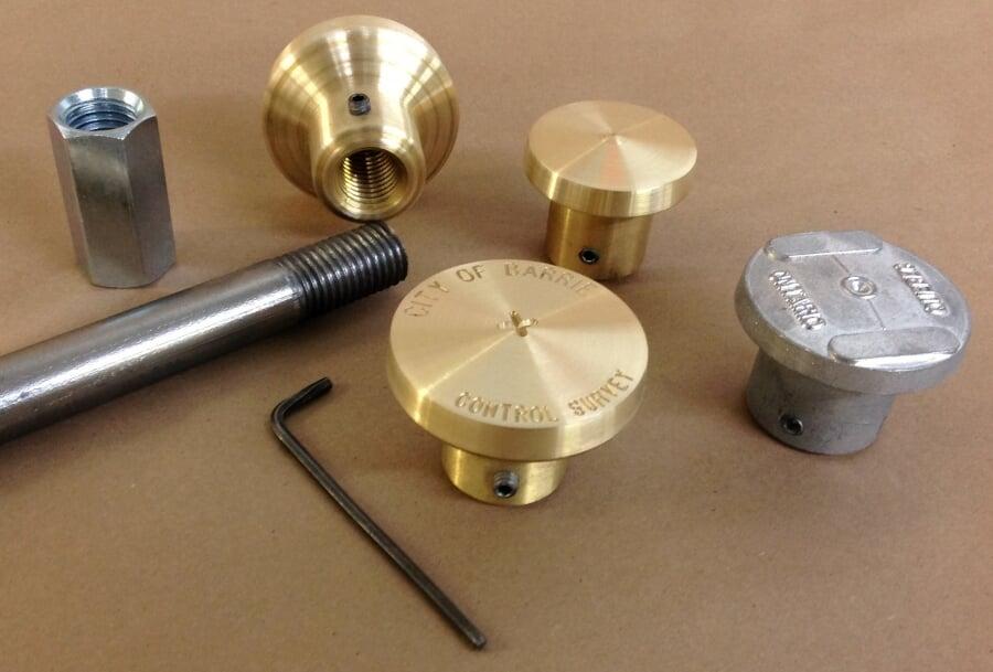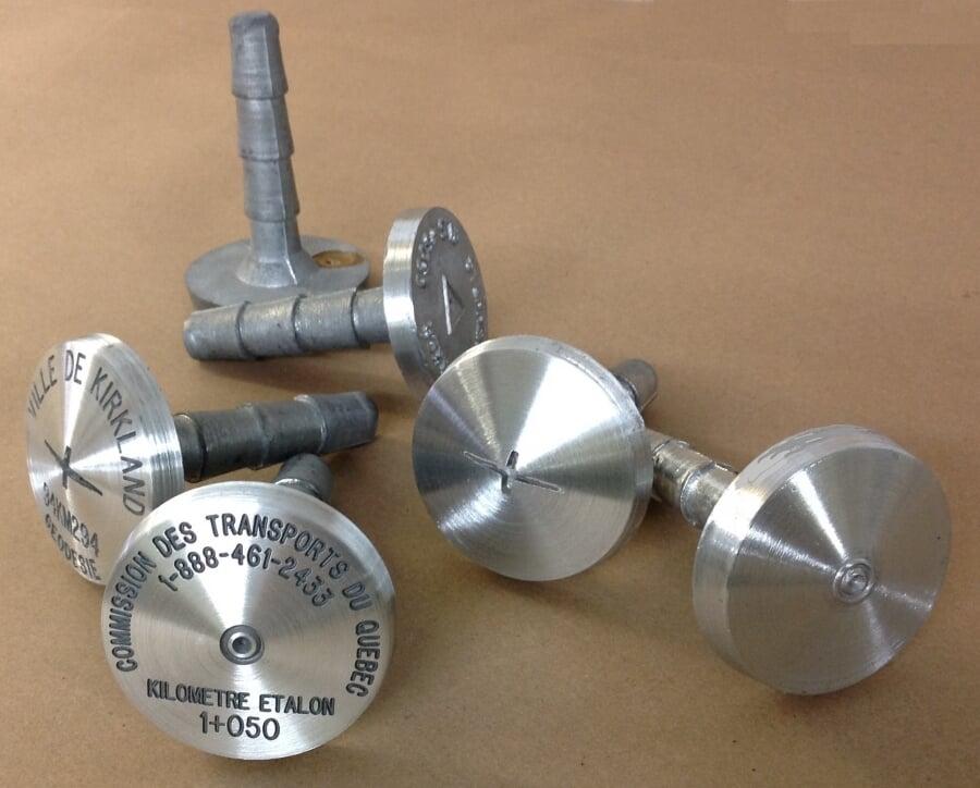 Ces repères sont conçus à partir d'une tige d'acier 25mm de diamètre avec extrémité filetée. Les médaillons de cuivre ou zinc sont aussi filetés pour répondre aux normes de plusieurs gouvernements municipaux et provinciaux de l'Ontario. Notre département de gravure pourra personnaliser vos médaillons.